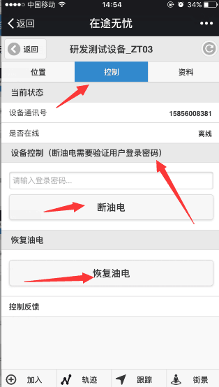 2、進入群組查車——用戶登錄——點擊群組——選擇車輛——點擊控制按鈕——輸入用戶密碼——點擊斷油電 / 恢復油電(如下圖所示)